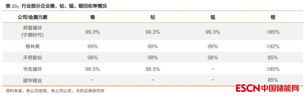 根據(jù)《新能源汽車廢舊動(dòng)力蓄電池綜合利用行業(yè)規(guī)范條件(2019 年本)》,從事動(dòng)力電池再生利用的企業(yè),其鎳、鈷、錳的綜合回收率應(yīng)不低于 98%,鋰的回收率不低于 85%,稀土等其他主要有價(jià)金屬綜合回收率不低于 97%,行業(yè)標(biāo)準(zhǔn)已經(jīng)達(dá)到較高水平。從企業(yè)端的實(shí)際應(yīng)用情況來看,各企業(yè)對(duì)鎳、鈷、錳的提取效率也已基本達(dá)到政策要求,而對(duì)鋰的提取率則普遍在 85-90%,當(dāng)前仍有一定的上升空間,提高鋰回收率已經(jīng)成為動(dòng)力回收利用企業(yè)強(qiáng)化自身盈利能力的另一方向。