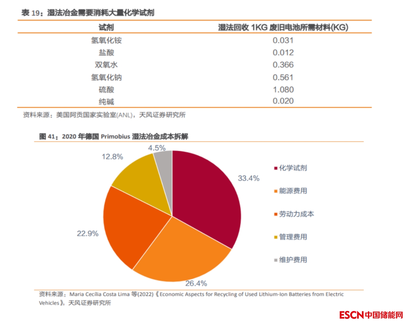 濕法冶金成本主要由化學(xué)試劑與能源費(fèi)用組成。一方面,濕法冶金需要消耗大量的化學(xué)試劑,這使得企業(yè)的濕法冶金成本將會(huì)受到硫酸、氫氧化鈉等化學(xué)試劑價(jià)格波動(dòng)的影響;另一方面,濕法冶金屬于高能耗行業(yè),企業(yè)的能源費(fèi)用普遍較高。以德國動(dòng)力電池回收企業(yè) Primobius 于 2020 年的濕法冶金成本情況來看,化學(xué)試劑與能源費(fèi)用的成本占比分別為 33.4%、26.4%,合計(jì)占比高達(dá) 59.8%。因此,提高化學(xué)試劑的使用效率、降低再生利用環(huán)節(jié)的能耗成本將是各動(dòng)力電池回收企業(yè)構(gòu)筑成本優(yōu)勢(shì)的著力點(diǎn)。
