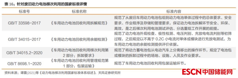 目前針對(duì)梯次利用動(dòng)力電池的標(biāo)準(zhǔn)還很少,現(xiàn)行動(dòng)力電池梯次利用的相關(guān)國標(biāo)僅有《車用動(dòng)力電池回收利用拆解規(guī)范》、《車用動(dòng)力電池回收利用余能檢測(cè)》、《車用動(dòng)力電池回收利用梯次利用第 2 部分:拆卸要求》和《車用動(dòng)力電池回收利用管理規(guī)范第 1 部分:包裝運(yùn)輸》,分別對(duì)應(yīng)梯次利用過程中的拆解、性能檢測(cè)、拆卸和包裝運(yùn)輸?shù)惹捌谔幚憝h(huán)節(jié),而對(duì)電池電性能、安全性能判別、分選重組及再退役等后續(xù)階段尚未進(jìn)行規(guī)范,梯次利用電池標(biāo)準(zhǔn)體系尚不清晰,規(guī)?;瘧?yīng)用存在難點(diǎn)。