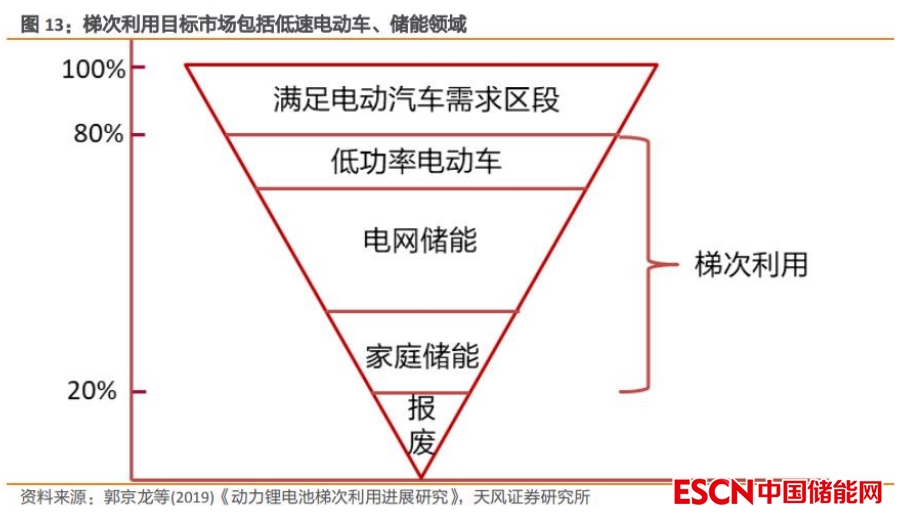 梯次利用目標(biāo)市場(chǎng)包括低速電動(dòng)車、儲(chǔ)能等領(lǐng)域。當(dāng)動(dòng)力電池容量低于 80%時(shí),其性能已經(jīng)不能滿足汽車正常行駛的要求,此時(shí)可以通過將廢舊動(dòng)力電池進(jìn)行改造,應(yīng)用到電池容量要求不高的低速電動(dòng)車、儲(chǔ)能等領(lǐng)域,實(shí)現(xiàn)梯次利用。