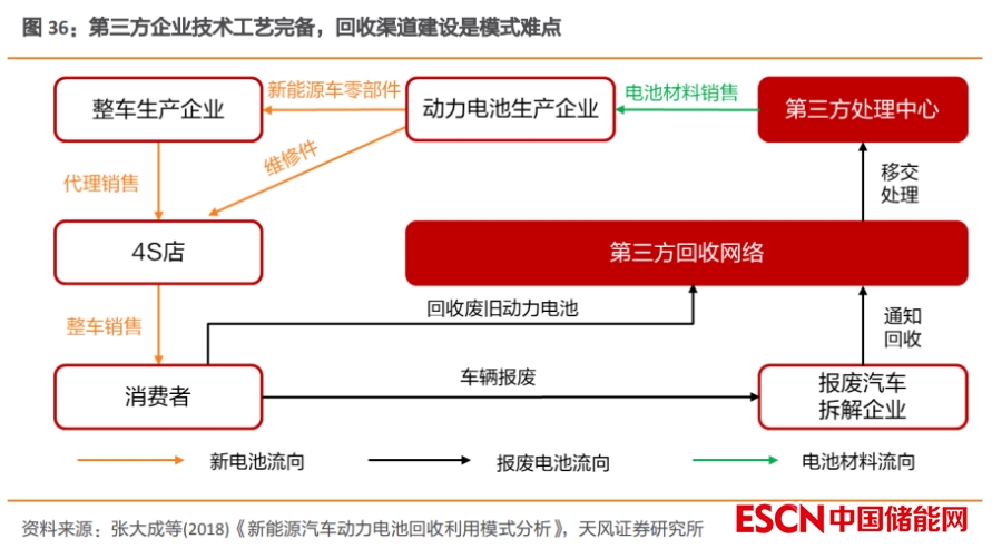 第三方企業(yè)技術(shù)工藝完備,回收渠道建設(shè)是模式難點(diǎn)。第三方模式具體是指由生產(chǎn)商委托專業(yè)的第三方如廢品收購公司、資源處理公司來負(fù)責(zé)廢舊動(dòng)力電池的回收,進(jìn)而實(shí)現(xiàn)“電池回收+后續(xù)利用”的一體化與專業(yè)化;但該模式要求第三方企業(yè)自行建立回收渠道,因此需要第三方公司通過與整車廠商、電池廠商達(dá)成深度合作的方式來形成穩(wěn)定的電池供應(yīng)源,模式存在著回收費(fèi)用較高、回收難度較大的問題與難點(diǎn)。