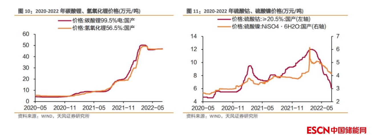 電池材料供不應(yīng)求,市價(jià)持續(xù)攀升。受下游需求旺盛與電池金屬產(chǎn)能受限的雙向促進(jìn),電池材料價(jià)格在過去兩年中連續(xù)上漲;截至 2022 年 7 月,電池級(jí)碳酸鋰、氫氧化鋰、硫酸鈷、硫酸鎳價(jià)格分別相較2020 年同期上漲了 1075%、835%、33%、54%,鋰價(jià)仍處于近年高位。資源價(jià)格上漲推高動(dòng)力電池回收利用的經(jīng)濟(jì)性,企業(yè)資本積極布局。