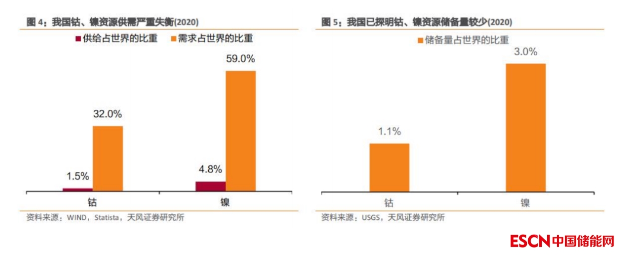 我國鈷、鎳資源供需嚴(yán)重失衡,已探明儲(chǔ)備量極少。從供需角度看,2020 年我國鈷、鎳資源需求分別占據(jù)世界總需求的 32%、59%,而供給量卻僅占世界總額的 1.5%和 4.8%,供需情況嚴(yán)重失衡,對(duì)外依存度極高。從資源儲(chǔ)備的角度看,世界已探明鈷資源達(dá) 710 萬噸,集中分布在剛果(50.7%)、澳大利亞(19.7%)等地區(qū);已探明鎳資源達(dá) 9400 萬噸,集中分布在印度尼西亞(22.3%)、澳大利亞(21.3%)、巴西(17.0%)。相較之下,我國已探明鈷、鎳資源儲(chǔ)備量分別僅為 8、280 萬噸,占世界總儲(chǔ)量的比重極低。