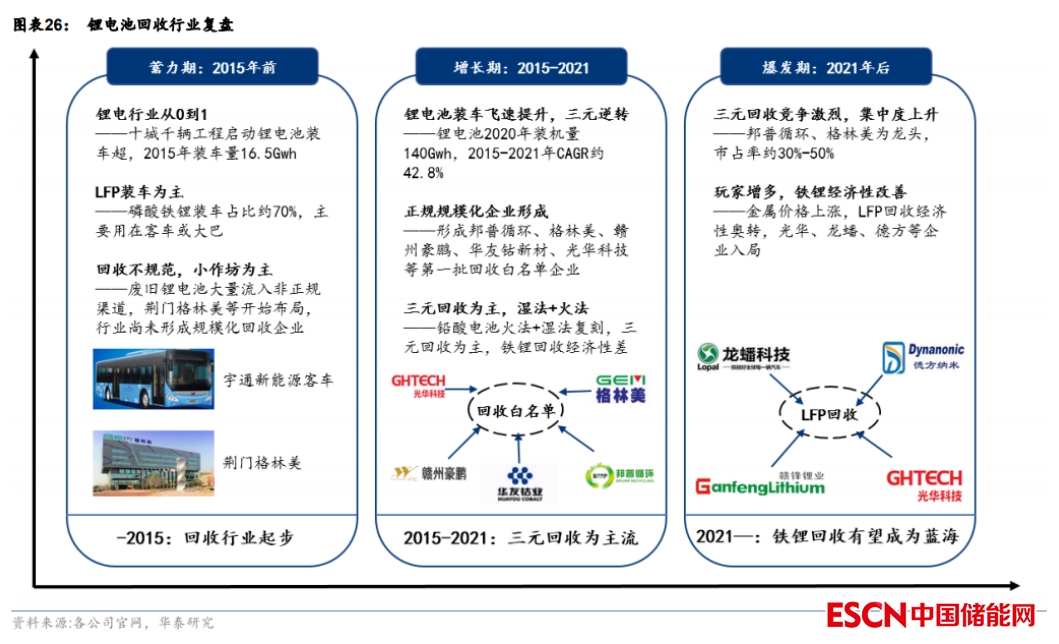 1) 蓄力期(2015 年前):鋰電池滲透到動(dòng)力領(lǐng)域,政策加持下開始發(fā)展,但 70%的裝車電池為磷酸鐵鋰電池,主要用于客車或大巴,鋰電池回收也剛起步,以小作坊為主。