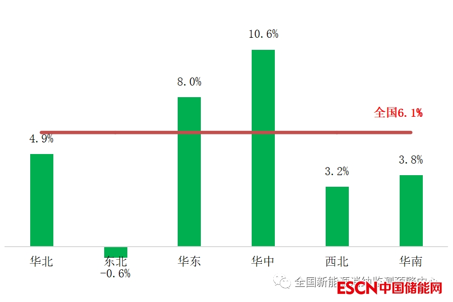 其中,三季度全國(guó)全社會(huì)用電量達(dá)到2.39萬(wàn)億千瓦時(shí),同比增長(zhǎng)6.1%。三季度在穩(wěn)經(jīng)濟(jì)政策措施逐步落地以及持續(xù)大范圍極端高溫天氣等因素拉動(dòng)下,用電量增速比二季度明顯回升,為新能源消納創(chuàng)造了良好條件。其中,7-8月全社會(huì)用電量增速較快,同比分別增長(zhǎng)6.25%和10.7%,9月全社會(huì)用電量與去年同期持平。分地區(qū)來(lái)看,華中、華東地區(qū)三季度用電增速高于全國(guó)平均水平。