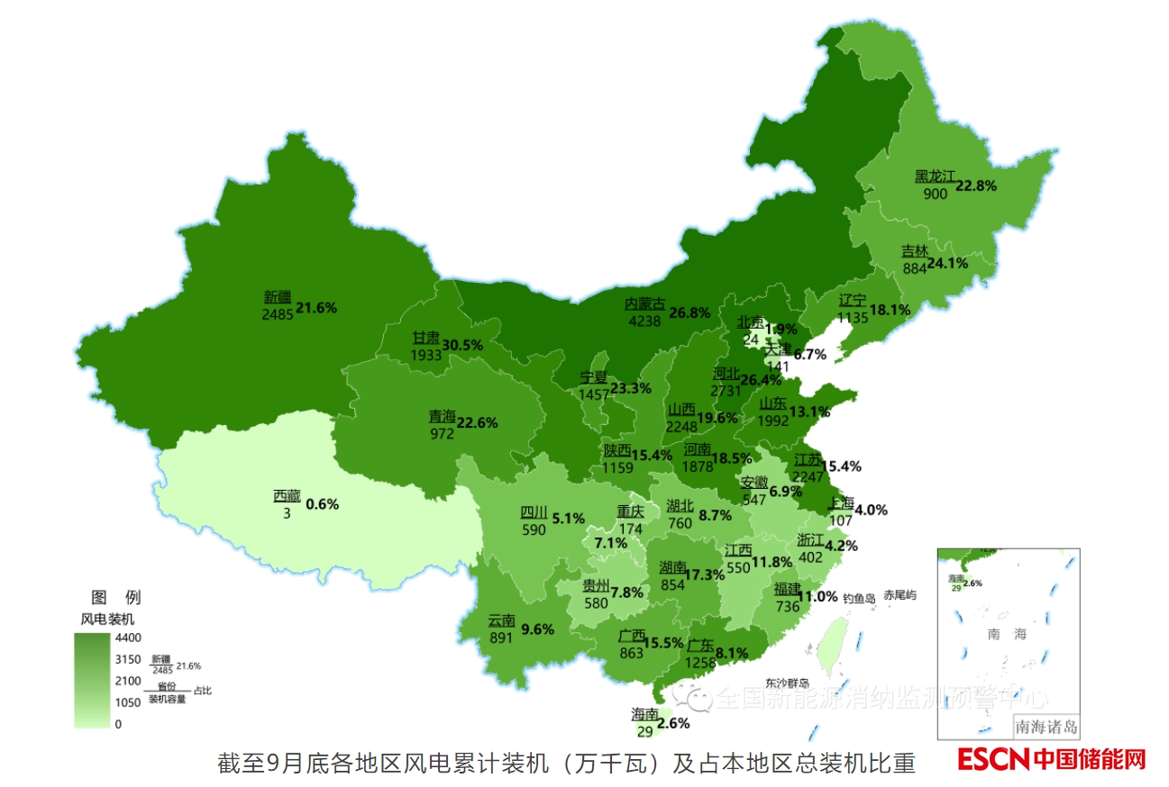 三季度風(fēng)電新增并網(wǎng)裝機(jī)以陸上風(fēng)電為主,陸上風(fēng)電新增裝機(jī)占風(fēng)電新增裝機(jī)的89.4%。陸上風(fēng)電主要集中分布在北方地區(qū);海上風(fēng)電新增裝機(jī)主要在廣東、浙江地區(qū)。