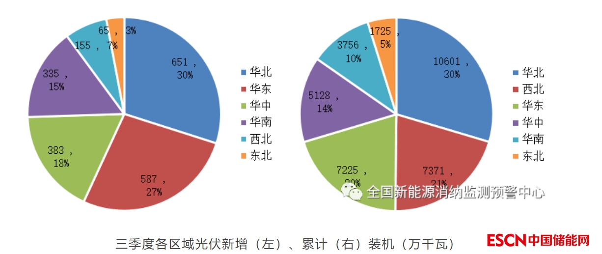 三季度,華北、華東地區(qū)光伏新增裝機(jī)1237萬(wàn)千瓦,占全國(guó)光伏新增裝機(jī)比重為56.9%。其中,華北、華東地區(qū)分布式光伏新增裝機(jī)1027萬(wàn)千瓦,占全國(guó)分布式光伏新增裝機(jī)比重為65.5%。