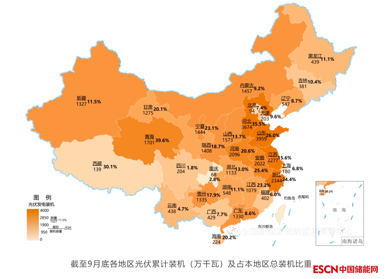 截至9月底,全國(guó)光伏累計(jì)裝機(jī)3.58億千瓦,同比增加28.9%。三季度,全國(guó)光伏新增裝機(jī)2175萬(wàn)千瓦,同比增加101.5%。新增裝機(jī)規(guī)模較大的省區(qū)主要有河北337萬(wàn)千瓦、山東244萬(wàn)千瓦、河南230萬(wàn)千瓦、浙江215萬(wàn)千瓦。新增裝機(jī)以分布式光伏為主,分布式光伏新增裝機(jī)1567.5萬(wàn)千瓦,占全國(guó)光伏新增裝機(jī)比重達(dá)到72.1%。