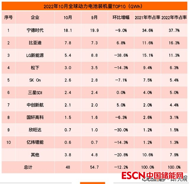除了中國(guó)企業(yè)10月裝機(jī)量出現(xiàn)環(huán)比下滑外,韓國(guó)企業(yè)LG新能源和SK On 的裝機(jī)量環(huán)比也有不同程度的下降。其中由于特斯拉銷量的下滑,LG新能源裝機(jī)量5.4GWh,環(huán)比大降38.6%,下降至第三;SK On裝機(jī)量2.6GWh,環(huán)比下降7.1%,位居第五。三星SDI裝機(jī)量2.4GWh,與9月持平。