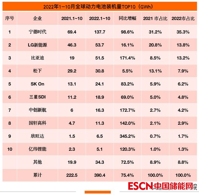 1-10月,全球動(dòng)力電池裝機(jī)量390.4GWh,同比增長(zhǎng)75.4%。全球排名第一寧德時(shí)代增長(zhǎng)近一倍,比亞迪等排名前十的中國(guó)企業(yè)均呈現(xiàn)三位數(shù)的高增長(zhǎng)勢(shì)頭。以LG新能源為首的韓國(guó)企業(yè)實(shí)現(xiàn)了兩位數(shù)的增長(zhǎng)。相反,包括松下在內(nèi)的日系企業(yè)大部分增長(zhǎng)率不及市場(chǎng)平均水平,持續(xù)呈下降趨勢(shì)。