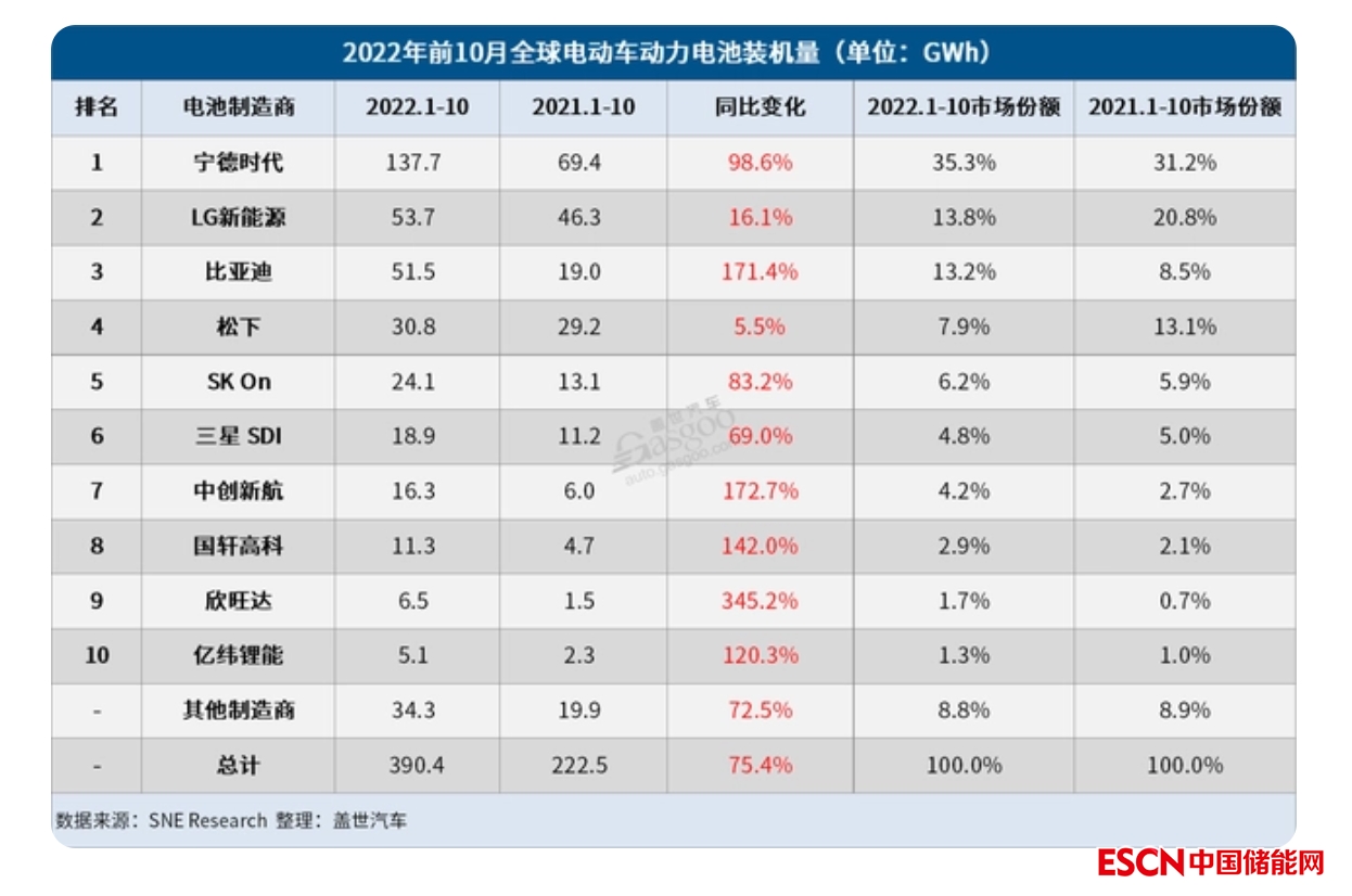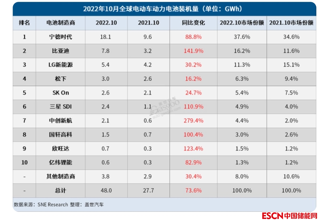 中國儲能網(wǎng)訊:12月2日,韓國市場研究機構SNE Research公布的數(shù)據(jù)顯示,2022年10月,全球電動汽車電池裝機量達到48 GWh,同比增長73.6%,連續(xù)28個月保持穩(wěn)定增長。在2021年創(chuàng)下“五連冠”的記錄后,寧德時代自年初以來已連續(xù)10個月在榜單中強勢領跑。比亞迪也不甘落后,一直與LG新能源角逐第二名,裝機量再創(chuàng)月度新高,并在榜單中再度奪得亞軍。
