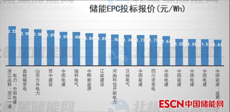 共有10個(gè)100MWh以上儲(chǔ)能項(xiàng)目EPC總承包開標(biāo),其中規(guī)模最大的是新疆阜康市60萬千瓦光伏+60萬千瓦時(shí)儲(chǔ)能項(xiàng)目EPC,該項(xiàng)目按25%/4h配置儲(chǔ)能系統(tǒng),儲(chǔ)能總?cè)萘繛?50MW/600MWh,是目前國內(nèi)新能源側(cè)儲(chǔ)能規(guī)模最大的項(xiàng)目。此次EPC招標(biāo)內(nèi)容不包含光伏及儲(chǔ)能設(shè)備采購,最終由水電十一局與中國電建中南院聯(lián)合體中標(biāo),其投標(biāo)價(jià)10.07億元。