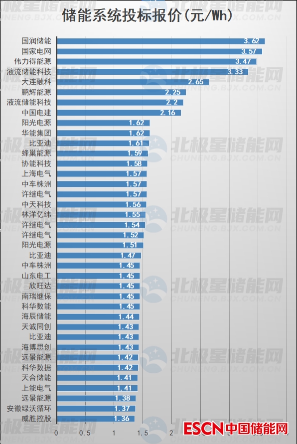 其中新能源配套儲(chǔ)能投標(biāo)報(bào)價(jià)最高的為華能甘肅永登坪城二期風(fēng)電7.5MW/15MWh儲(chǔ)能系統(tǒng)采購,中標(biāo)人為華能清能院,投標(biāo)報(bào)價(jià)2431.7萬元,投標(biāo)單價(jià)約1.62元/Wh。
