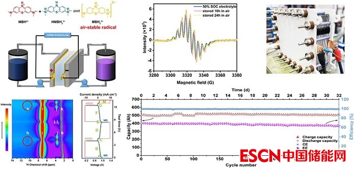 本工作中,團(tuán)隊通過研究電解液中的不同組分間的相互作用,實現(xiàn)了電解液組分優(yōu)化,大幅度提高了電池容量。團(tuán)隊通過電化學(xué)—原位核磁共振技術(shù)發(fā)現(xiàn),MB分子在電池運(yùn)行時會發(fā)生歸中反應(yīng)生成自由基態(tài);電子自旋共振技術(shù)和理論計算結(jié)果表明,自由基態(tài)和還原態(tài)在空氣中的穩(wěn)定是該分子電化學(xué)反應(yīng)高度可逆和結(jié)構(gòu)穩(wěn)定的重要原因。為了進(jìn)一步驗證MB分子在有機(jī)液流電池中應(yīng)用的可行性,團(tuán)隊組裝了10節(jié)1000cm2的有機(jī)液流電池電堆,電堆的瞬時放電功率超過了1kW,并連續(xù)運(yùn)行32天,容量幾乎沒有衰減。此外,團(tuán)隊還對MB電解液在高溫70℃進(jìn)行了加速壽命衰減測試,并分析了其可能的衰減機(jī)理。該項研究不僅闡釋了有機(jī)活性分子的耐氧化機(jī)理,為分子的設(shè)計提供重要參考;而且開發(fā)的千瓦級電堆有望為水系有機(jī)液流電池從實驗室走向?qū)嵱没峁┝己玫慕梃b。