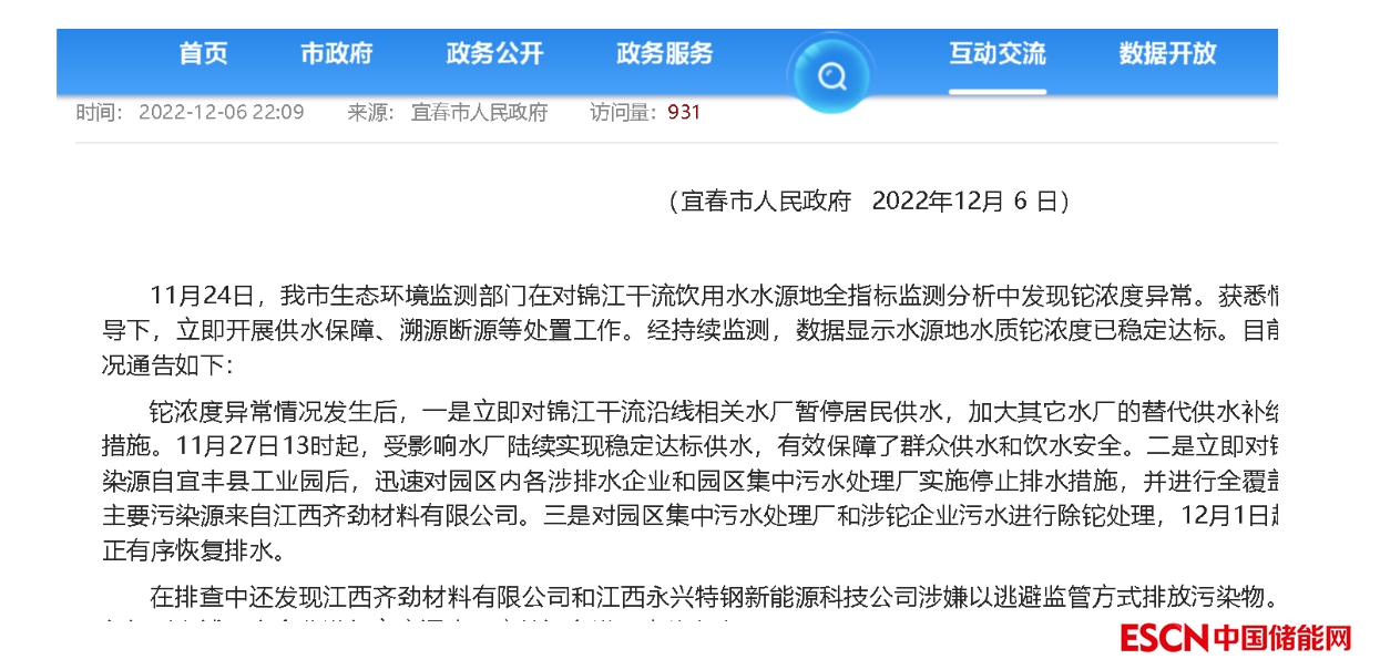 中國(guó)儲(chǔ)能網(wǎng)訊:進(jìn)入12月,江西宜春多家鋰電企業(yè)停產(chǎn),使得當(dāng)?shù)丨h(huán)保問題引起關(guān)注。
