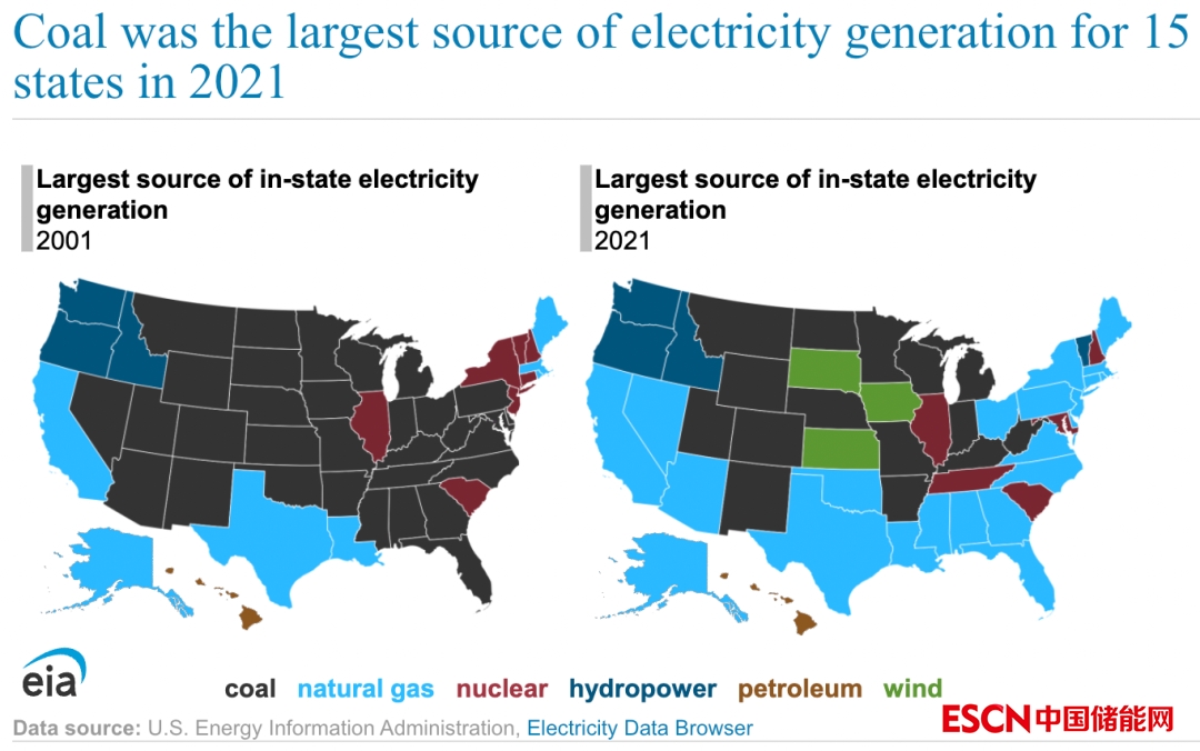 2001年,天然氣曾是7個(gè)州最大發(fā)電來(lái)源。到2021年,受燃煤發(fā)電廠普遍退役和新建天然氣發(fā)電廠的推動(dòng),這一數(shù)字已增至23個(gè)州。在此期間,風(fēng)能和太陽(yáng)能發(fā)電量也在增長(zhǎng)。燃煤電廠在經(jīng)濟(jì)上沒(méi)有競(jìng)爭(zhēng)力,而天然氣和可再生能源成本相對(duì)較低。
