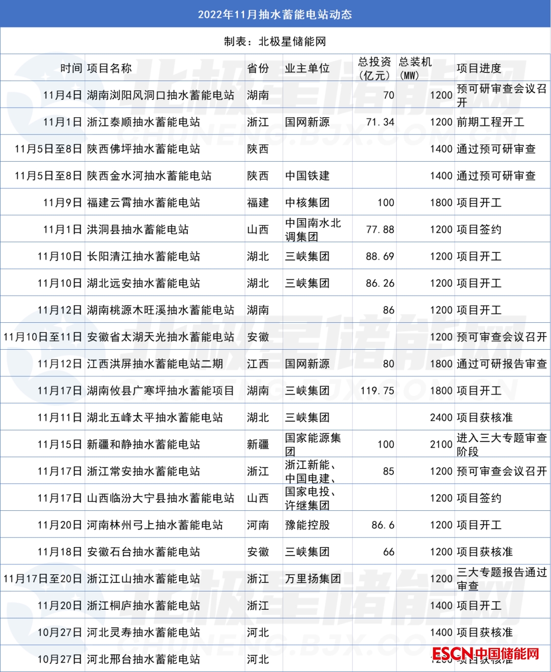 中國(guó)儲(chǔ)能網(wǎng)訊:據(jù)不完全統(tǒng)計(jì),2022年11月,共有45個(gè)抽水蓄能電站項(xiàng)目更新了動(dòng)態(tài),規(guī)模超65GW,包含預(yù)可行性研究報(bào)告審查、簽約、開(kāi)工等動(dòng)態(tài),項(xiàng)目規(guī)模普遍在1200MW-2400MW,其中河北省建設(shè)規(guī)模最大。(詳表見(jiàn)文末)