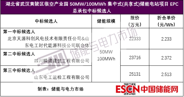 中國(guó)儲(chǔ)能網(wǎng)訊:近日,湖北省武漢黃陂區(qū)臨空產(chǎn)業(yè)園50MW/100MWh集中式(共享式)儲(chǔ)能電站項(xiàng)目EPC總承包中標(biāo)候選人對(duì)外發(fā)布。北京天源科創(chuàng)風(fēng)電技術(shù)有限責(zé)任公司&山東電工時(shí)代能源科技公司聯(lián)合體以總報(bào)價(jià)22333萬(wàn)元,折合單價(jià)2.233元/Wh,成為第一中標(biāo)候選人。