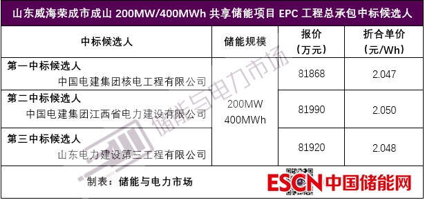 中國儲能網(wǎng)訊:近日,山東威海榮成市成山200MW/400MWh共享儲能項目EPC工程總承包中標(biāo)候選人對外發(fā)布。中國電建集團(tuán)核電工程有限公司以總報價81868萬元,折合單價2.047元/Wh,成為第一中標(biāo)候選人。