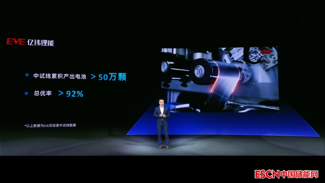 動(dòng)力電池研究院圓柱電池研究所所長(zhǎng)徐悅斌,發(fā)布新一代大圓柱電池的研發(fā)樣品:能量密度350Wh/kg,可實(shí)現(xiàn)9分鐘超快充。在電池性能再創(chuàng)新高的同時(shí),由億緯鋰能自主研發(fā)的大圓柱中試線,已累計(jì)制樣超50萬(wàn)顆,整體優(yōu)率達(dá)到92%。