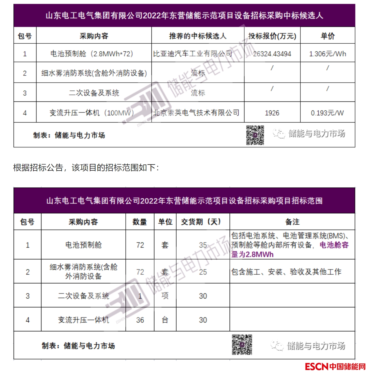 中國(guó)儲(chǔ)能網(wǎng)訊:近日,山東電工電氣集團(tuán)有限公司2022年?yáng)|營(yíng)儲(chǔ)能示范項(xiàng)目設(shè)備招標(biāo)采購(gòu)?fù)扑]的中標(biāo)候選人公示發(fā)布。該項(xiàng)目?jī)?chǔ)能容量100MW/200MWh,其中電池預(yù)制艙采購(gòu)規(guī)模為201.6MWh。