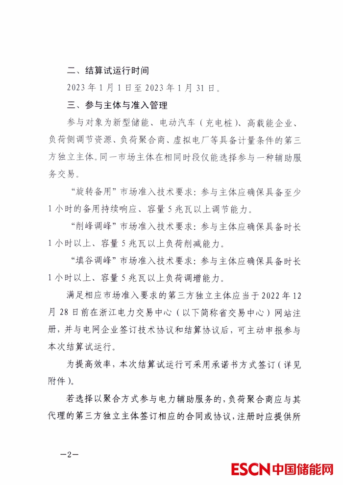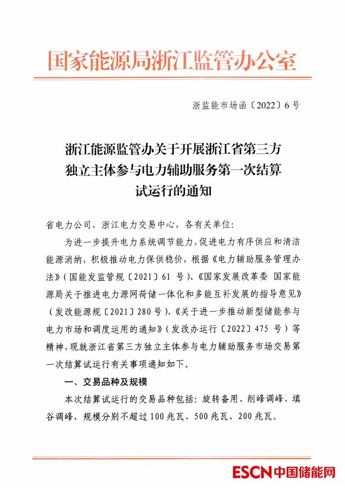 中國儲能網訊:日前,浙江能監(jiān)辦發(fā)布關于開展浙江省第三方獨立主體參與電力輔助服務第一次結算試運行的通知。文件指出,本次結算試運行的交易品種包括:旋轉備用、削峰調峰、填谷調峰,規(guī)模分別不超過100兆瓦、500兆瓦、200兆瓦。