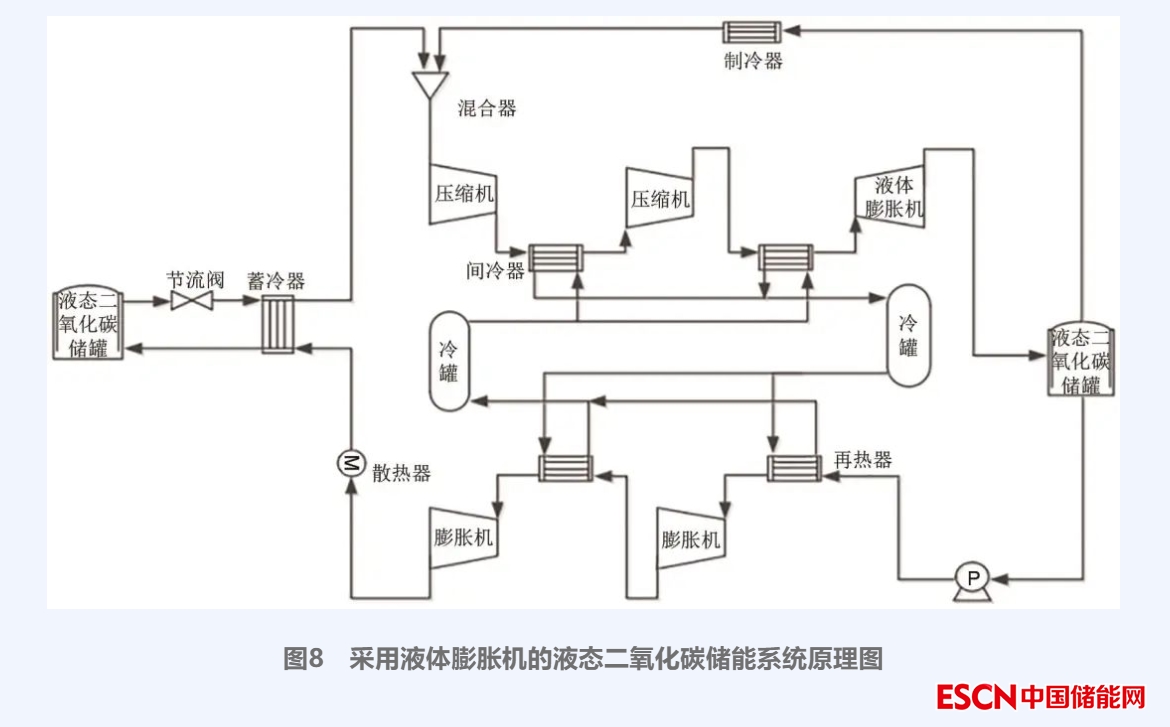 LCES系統(tǒng)在壓縮后也可以采用節(jié)流閥或液體膨脹機(jī)通過(guò)節(jié)流效應(yīng)進(jìn)行液化,但由于節(jié)流過(guò)程仍有部分CO2不能液化,所以需要配置氣液分離器并將氣態(tài)CO2返回壓縮機(jī)繼續(xù)壓縮液化,這種系統(tǒng)可以避免外設(shè)低溫冷卻系統(tǒng)。吳毅等設(shè)計(jì)的一種采用液態(tài)膨脹機(jī)的液態(tài)二氧化碳儲(chǔ)能系統(tǒng)如圖8所示,該系統(tǒng)在高壓側(cè)的儲(chǔ)能過(guò)程和釋能過(guò)程分別采用液體膨脹機(jī)和低溫泵控制儲(chǔ)能壓力和釋能壓力。通過(guò)熱力學(xué)分析和多目標(biāo)優(yōu)化,發(fā)現(xiàn)該系統(tǒng)最佳釋能壓力為18.3 MPa,最佳儲(chǔ)能壓力為11.7 MPa,對(duì)應(yīng)系統(tǒng)儲(chǔ)能效率為50.4%,儲(chǔ)能密度為21.7 kWh/m3。但由于存在膨脹機(jī)功損失,意味著這個(gè)系統(tǒng)還有很大的改進(jìn)潛力。