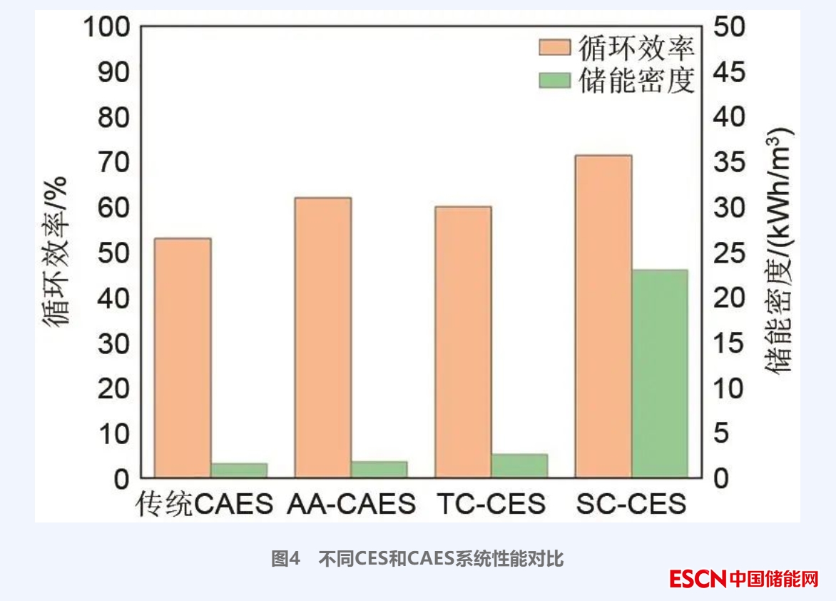 北京大學(xué)Zhang等研究了基于熱水蓄熱的跨臨界和超臨界壓縮二氧化碳儲(chǔ)能系統(tǒng)。如圖3所示,這兩種系統(tǒng)本質(zhì)上沒(méi)有區(qū)別,TC-CES系統(tǒng)相較于SC-CES系統(tǒng)另外設(shè)計(jì)了壓縮前預(yù)熱器,目的是使低壓儲(chǔ)罐中的液態(tài)CO2在進(jìn)入壓縮機(jī)前完全氣化,而SC-CES系統(tǒng)低壓儲(chǔ)罐中CO2本身就處于超臨界態(tài),可直接進(jìn)入壓縮機(jī)。研究發(fā)現(xiàn)系統(tǒng)以1 MW釋能功率輸出時(shí),跨臨界運(yùn)行CO2工質(zhì)流量為38.52 kg/s,循環(huán)效率為60%,儲(chǔ)能密度為2.6 kWh/m3;超臨界運(yùn)行CO2工質(zhì)流量為6.89 kg/s,循環(huán)效率為71%,?效率為71.38%,儲(chǔ)能密度為23 kWh/m3。結(jié)合文獻(xiàn)[21-22]的研究結(jié)果,圖4對(duì)比了傳統(tǒng)CAES、AA-CAES、TC-CES和SC-CES系統(tǒng)在釋能功率均為1 MW工況下的循環(huán)效率和能量密度數(shù)據(jù)??梢园l(fā)現(xiàn),TC-CES的循環(huán)效率高于傳統(tǒng)CAES,但略低于AA-CAES,其儲(chǔ)能密度均高于傳統(tǒng)CAES和AA-CAES;而SC-CES的循環(huán)效率最大,且其儲(chǔ)能密度遠(yuǎn)高于其他三種系統(tǒng)。因此,雖然SC-CES比CAES系統(tǒng)額外增加了低壓儲(chǔ)存設(shè)備用于釋能過(guò)程中透平存儲(chǔ)出口CO2(對(duì)于SC-CES系統(tǒng)此時(shí)CO2仍處于超臨界態(tài)),但由于其工質(zhì)整體儲(chǔ)存容積需求較低,所以仍具有較高的儲(chǔ)能密度。