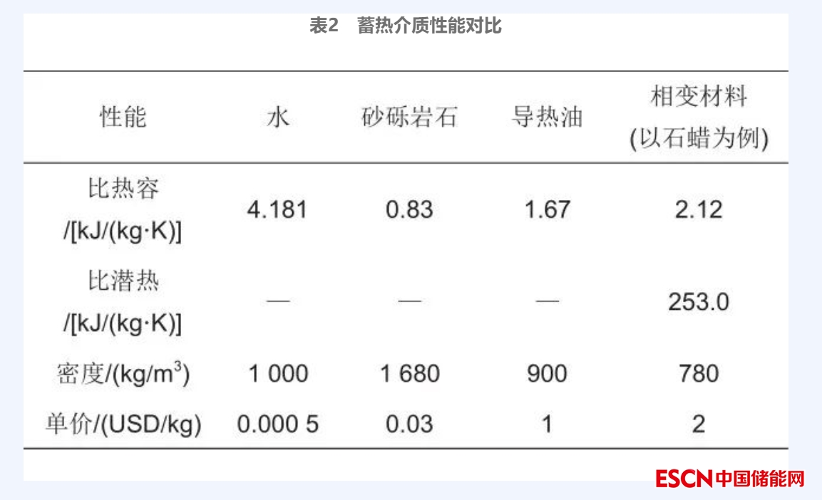 二氧化碳電熱儲(chǔ)能系統(tǒng)在蓄熱端進(jìn)行顯熱交換,CO2處于單相區(qū);在蓄冷端進(jìn)行潛熱交換,CO2處于兩相區(qū)。因此,系統(tǒng)換熱過(guò)程具有較好的熱匹配性。由于液態(tài)水的高熱容、高流動(dòng)性特性,且成本極低,相比于其他常見(jiàn)蓄熱介質(zhì)(表2),在儲(chǔ)能系統(tǒng)蓄換熱過(guò)程中被廣泛使用。