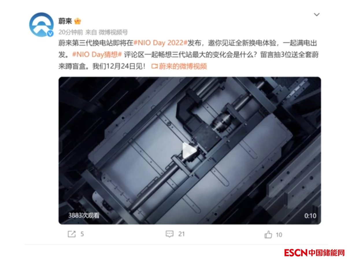 中國儲能網(wǎng)訊:12月21日上午,蔚來官微正式宣布,蔚來全新的第三代換電站將會在12月24日舉辦的NIO Day 2022正式發(fā)布。未來同時還放上了一段短片,似乎是新?lián)Q電站中更換車輛電池包的畫面。