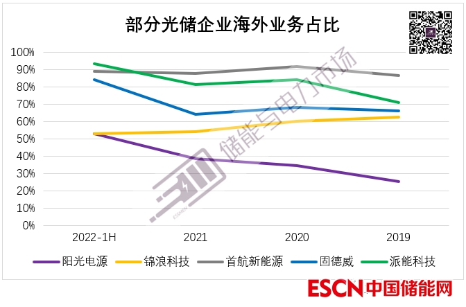 以派能、錦浪、固德威等為代表的傳統(tǒng)深耕戶用儲能和分布式光伏逆變器的企業(yè)自然當仁不讓,紛紛抓住借道戶用儲能電池和逆變器的機會實現新的業(yè)績增長,其海外業(yè)務占比已經超過80%。