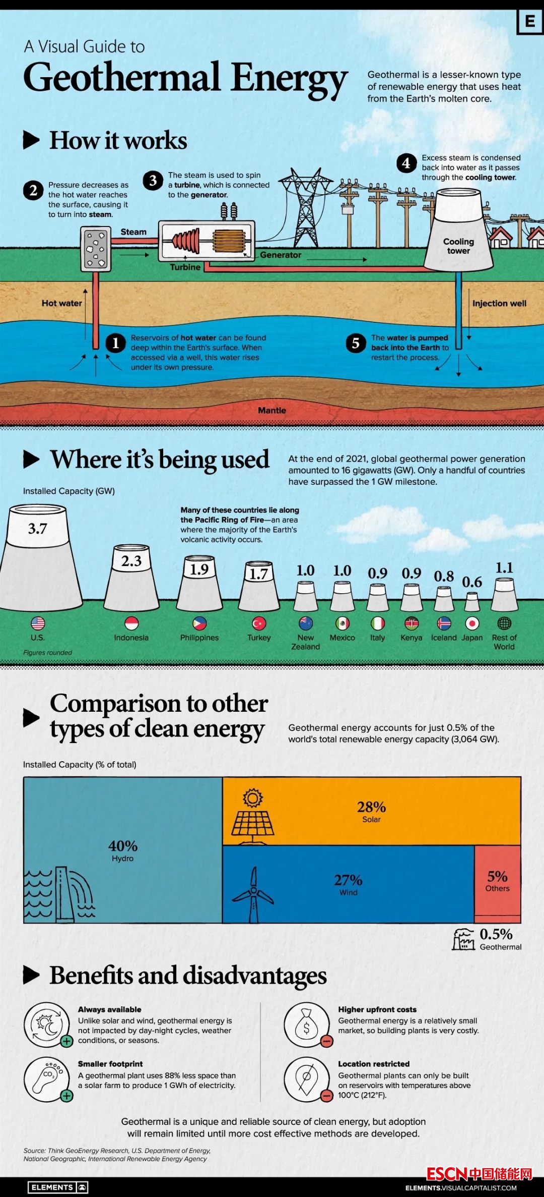 中國(guó)儲(chǔ)能網(wǎng)訊:地?zé)崾且环N鮮為人知的可再生能源,它利用地球熔融核心的熱量發(fā)電。雖然這一獨(dú)特的特性使其比太陽(yáng)能和風(fēng)能具有關(guān)鍵優(yōu)勢(shì),但它也受到高昂的成本和地理限制。因此,很少有國(guó)家能夠大規(guī)模生產(chǎn)地?zé)崮?。Virtual Capitalist網(wǎng)站發(fā)表信息圖中,介紹地?zé)崮艿膽?yīng)用。