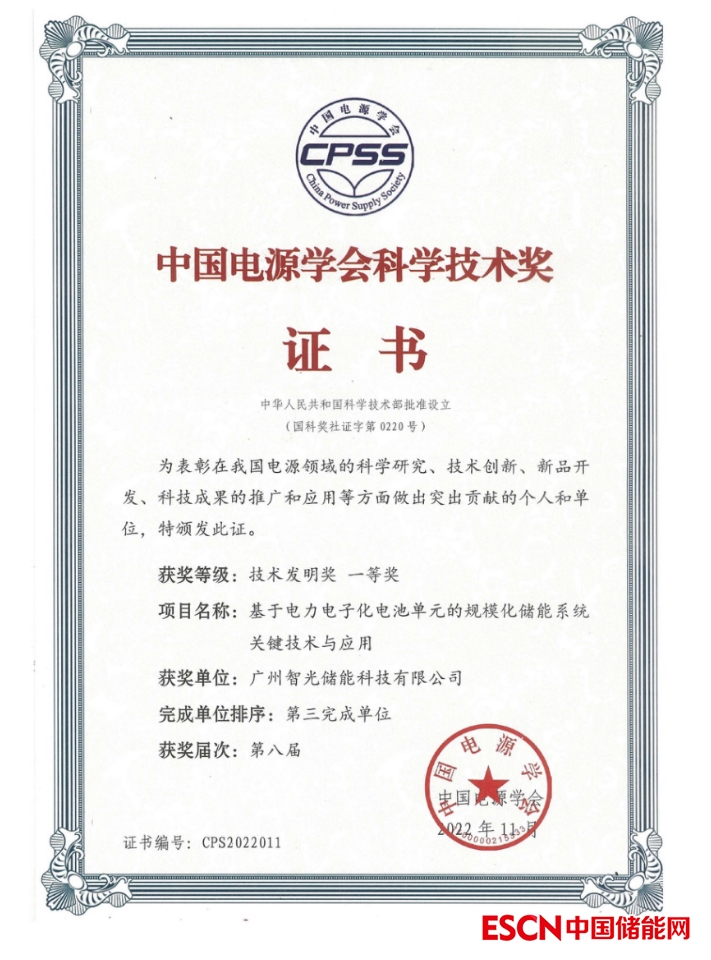 2、2022年11月,智光儲(chǔ)能參與的《基于電力電子化電池單元的規(guī)?;瘍?chǔ)能系統(tǒng)關(guān)鍵技術(shù)與應(yīng)用》獲得第八屆中國(guó)電源學(xué)會(huì)科學(xué)技術(shù)一等獎(jiǎng)。