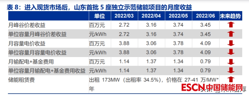 商業(yè)化示范初見成效,山東儲(chǔ)能發(fā)展邁入市場(chǎng)化驅(qū)動(dòng)階段。山東首批 5 座獨(dú)立示范儲(chǔ) 能項(xiàng)目于 21 年底陸續(xù)投運(yùn),容量共計(jì) 501MW/1002MWh。22 年 3 月,3 家獨(dú)立儲(chǔ)能首 次參與山東電力現(xiàn)貨市場(chǎng)交易,山東成為國(guó)內(nèi)首個(gè)獨(dú)立儲(chǔ)能參與電力現(xiàn)貨市場(chǎng)的省份。根 據(jù)山東電力調(diào)度控制中心數(shù)據(jù),2022 年 H1,山東運(yùn)行中的新型儲(chǔ)能累計(jì)充電 1.63 億千瓦 時(shí),累計(jì)放電 1.36 億千瓦時(shí),效率為 83.6%,其中 5 座獨(dú)立示范儲(chǔ)能電站累計(jì)充電 1.18 億千瓦時(shí),累計(jì)放電 0.94 億千瓦時(shí),效率為 79.0%。目前山東儲(chǔ)能項(xiàng)目在現(xiàn)貨市場(chǎng)的收益 主要由峰谷價(jià)差套利、容量電價(jià)和儲(chǔ)能租賃構(gòu)成,儲(chǔ)能發(fā)展進(jìn)入市場(chǎng)化驅(qū)動(dòng)階段。