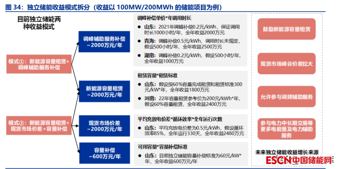 目前中國(guó)獨(dú)立儲(chǔ)能收益模式主要分為兩種。在電力現(xiàn)貨市場(chǎng)未建立地區(qū),青海、寧夏 和湖南等多個(gè)省市出臺(tái)了獨(dú)立儲(chǔ)能電站調(diào)峰補(bǔ)償標(biāo)準(zhǔn)。獨(dú)立儲(chǔ)能收益模式以調(diào)峰補(bǔ)償+容量 租賃為主。在山東等建立電力現(xiàn)貨市場(chǎng)的地區(qū),獨(dú)立儲(chǔ)能收益模式以現(xiàn)貨市場(chǎng)套利+容量租賃+容量補(bǔ)償為主。以 100MW/200MWh 的獨(dú)立儲(chǔ)能為例,目前獨(dú)立儲(chǔ)能兩種商業(yè)模式下, 穩(wěn)定的可預(yù)期收益每年可達(dá)到 4000 萬元以上。