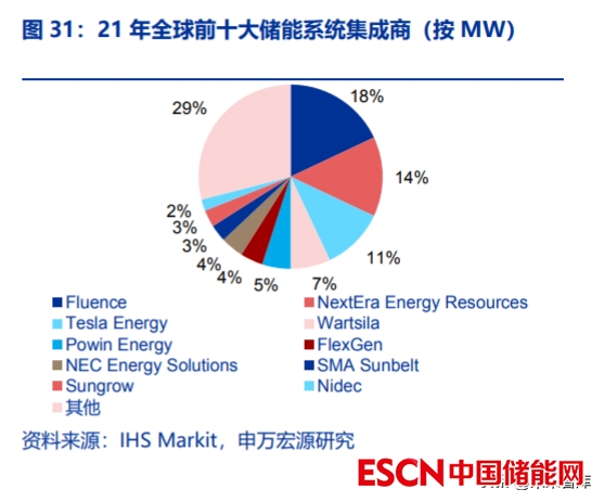 陽光電源:從 PCS 延伸至儲(chǔ)能系統(tǒng),美國(guó)訂單飽滿。2021 年,公司儲(chǔ)能系統(tǒng)全球發(fā) 貨 3GWh、儲(chǔ)能變流器全球發(fā)貨 2.5GW,實(shí)現(xiàn)儲(chǔ)能業(yè)務(wù)收入 31.4 億元。根據(jù)公司公告, 22 年公司分別與美國(guó) Plus power 和 Key Capture Energy 簽署了 14.9 億元和 7.9 億元的 儲(chǔ)能項(xiàng)目合同。