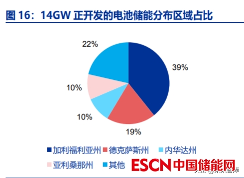 截止 3Q22,美國(guó)約有 14GW/37GWh 的儲(chǔ)能項(xiàng)目處于開發(fā)中。根據(jù)美國(guó)清潔能源協(xié) 會(huì)統(tǒng)計(jì),截止 3Q22,美國(guó)正在開發(fā)的清潔電力項(xiàng)目共 132GW(相當(dāng)于可支持 3400 萬美 國(guó)家庭的電力需求),其中光伏/陸風(fēng)/海風(fēng)/電池儲(chǔ)能分別占 59%/17%/13%/11%。美國(guó) 正在開發(fā)的 14GW/37GWh 儲(chǔ)能項(xiàng)目地區(qū)分布上,約 5.5GW 位于加利福尼亞州,超過 2.7GW 在德克薩斯州,內(nèi)華達(dá)州和亞利桑那州均為 1.4GW 左右。