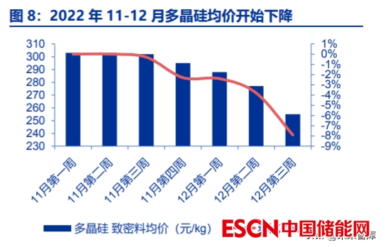 硅料產(chǎn)能釋放打開光伏裝機(jī)彈性。2022 年光伏終端需求增長(zhǎng)旺盛,國(guó)內(nèi)多晶硅現(xiàn)貨價(jià) 從年初的24萬元/噸漲至8 月的超30萬元/噸,預(yù)計(jì)2022年國(guó)內(nèi)多晶硅供應(yīng)量為92萬噸, 可支撐交流側(cè)裝機(jī)240-250GW,下游地面電站的裝機(jī)增長(zhǎng)仍受制于硅料供應(yīng)瓶頸和價(jià)格。 2023 年將迎硅料產(chǎn)能釋放大年,結(jié)合 Solarzoom 相關(guān)統(tǒng)計(jì),全球硅料名義產(chǎn)能將從 22 年底的 128 萬噸增長(zhǎng)至 23 年底的 240 萬噸,預(yù)計(jì) 23 年多晶硅全球供應(yīng)量約為 147 萬 噸,可支撐超 400GW 的交流側(cè)裝機(jī)。23 年起硅料新增產(chǎn)能開始批量釋放,對(duì)應(yīng)硅料價(jià)格 開啟下行通道,也為對(duì)組價(jià)價(jià)格敏感度較高的集中式電站項(xiàng)目的建設(shè)帶來了彈性。