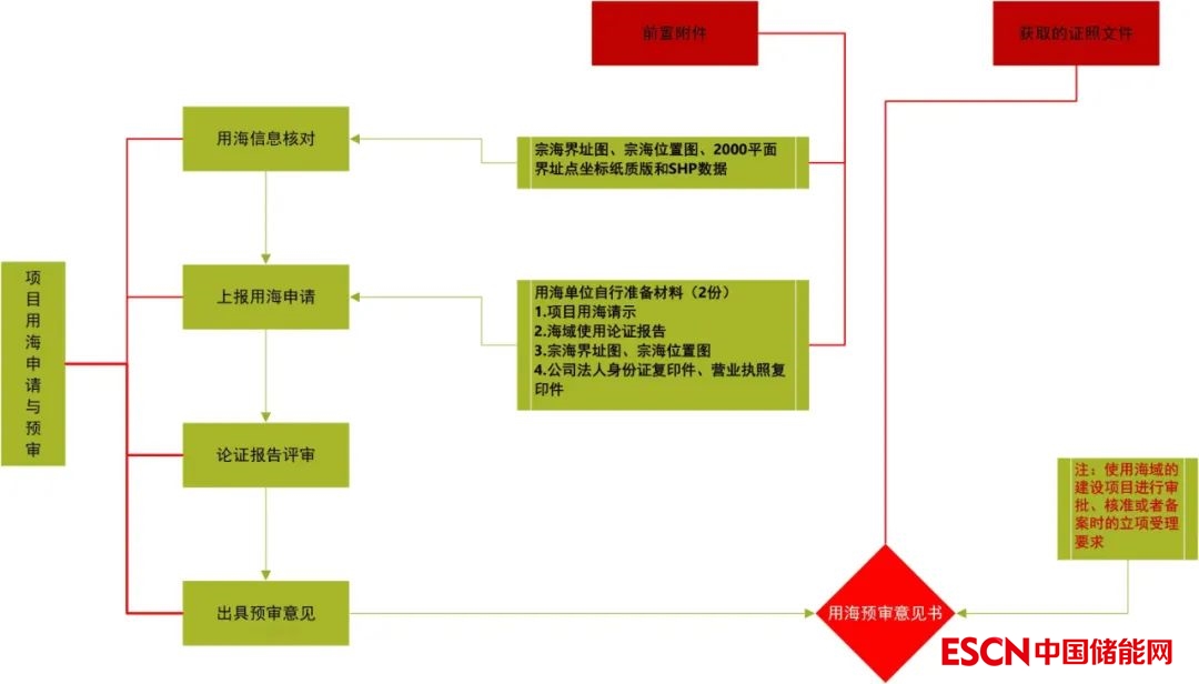 項(xiàng)目用海申請、海域使用論證報(bào)告、宗海界址圖、宗海位置圖、海域使用論證專家評審意見、企業(yè)法人身份證復(fù)印件及營業(yè)執(zhí)照復(fù)印件、大地2000平面界址坐標(biāo)和SHP數(shù)據(jù)。用海預(yù)審辦理流程如下圖所示: