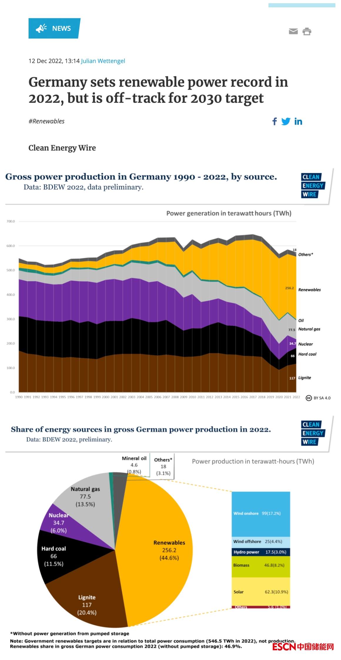 2022年可再生能源將占德國總用電量的44.6%(高于2021年的41%)。2020年,德國可再生能源在電力使用中所占比例曾達到45.2%。