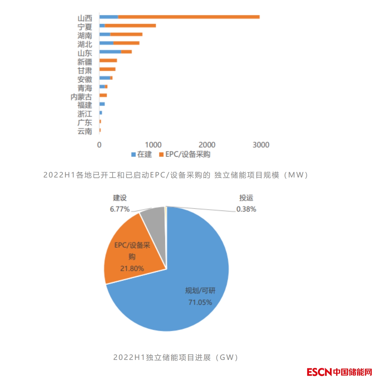 根據(jù)儲能與電力市場統(tǒng)計,2022年上半年并網投 運的獨立儲能電站共2座、啟動施工建設的項目共17個、進入/完成EPC和儲能設備招標的項目共64個,總計規(guī)模9.24GW/18.55GWh;