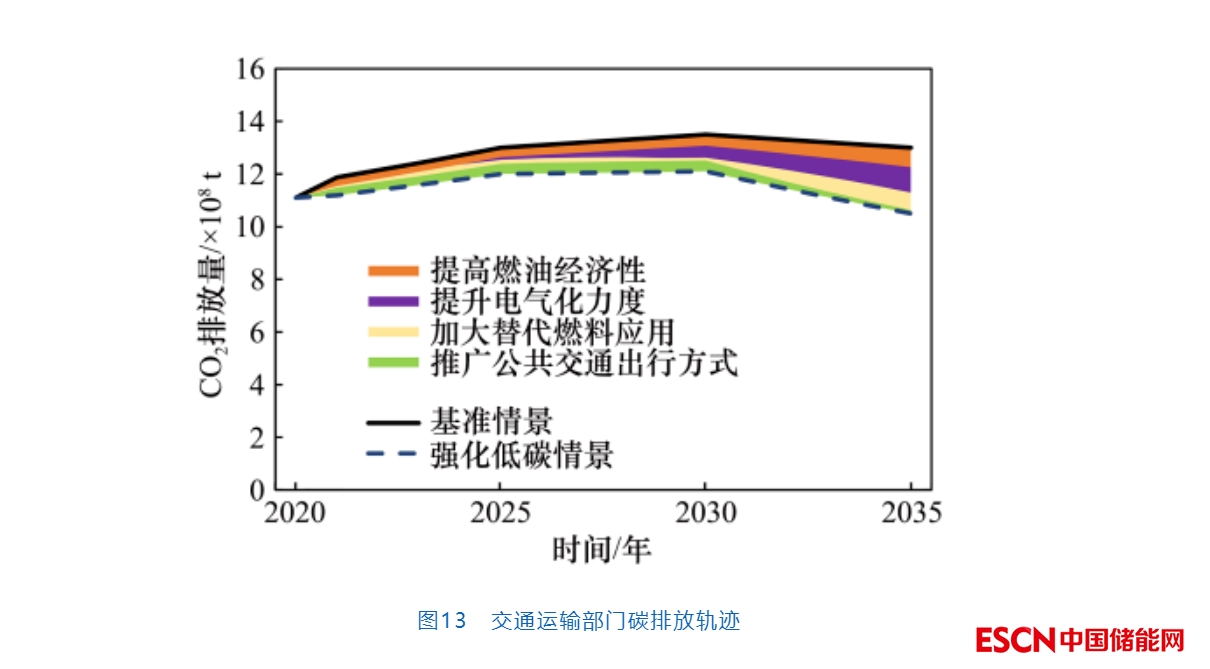 交通運(yùn)輸部門是化石能源消耗和CO2排放增長(zhǎng)最快的領(lǐng)域之一。降低交通運(yùn)輸部門碳排放的主要技術(shù)措施包括:通過(guò)能效提升提高各類交通運(yùn)輸工具的燃油經(jīng)濟(jì)性,降低各類運(yùn)輸工具的運(yùn)行能耗;加大交通運(yùn)輸工具的電氣化程度,擴(kuò)大電動(dòng)車和混合動(dòng)力的應(yīng)用規(guī)模和范圍;發(fā)展燃料乙醇、生物柴油、燃料電池、可再生能源制氫及可再生合成燃料等替代技術(shù),加大替代燃料的應(yīng)用;大力發(fā)展公共交通,推廣公共出行方式(見(jiàn)圖13)。2025年前,提高燃油經(jīng)濟(jì)性、推廣公共交通是交通部門脫碳的主要路徑;2030年左右,提升電氣化力度將促進(jìn)交通部門進(jìn)一步脫碳;2035年新能源汽車保有量占乘用車比例將超過(guò)25%,電力占交通能源消費(fèi)總量比例將超過(guò)22%。隨著合成替代燃料技術(shù)的成熟以及以新能源為主體的電力系統(tǒng)逐步建成,2035年后可再生燃料替代將在交通運(yùn)輸領(lǐng)域減碳上發(fā)揮關(guān)鍵作用。此外,交通運(yùn)輸部門還需進(jìn)一步通過(guò)加快大宗貨物和中長(zhǎng)距離貨物運(yùn)輸?shù)摹肮D(zhuǎn)鐵”“公轉(zhuǎn)水”等方式優(yōu)化運(yùn)輸結(jié)構(gòu),加快發(fā)展智慧交通,提高運(yùn)輸組織效率。