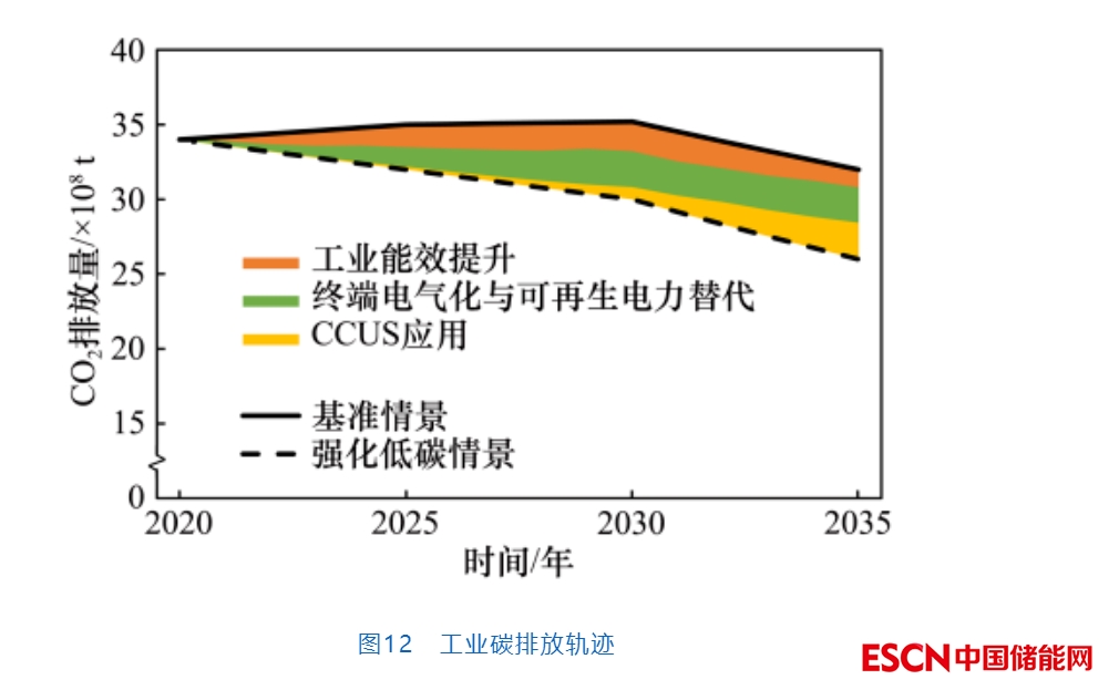 工業(yè)是僅次于能源電力部門的第二大CO2排放部門?;鶞?zhǔn)情景下工業(yè)部門的CO2排放先緩慢增長(zhǎng)再下降,強(qiáng)化低碳情景下工業(yè)部門的CO2排放下降速度加快(見(jiàn)圖12)。工業(yè)領(lǐng)域能效的大幅提升、風(fēng)光清潔能源的應(yīng)用以及CCUS的規(guī)?;瘧?yīng)用將是工業(yè)碳排放降低的關(guān)鍵舉措。工業(yè)用能大約在2030年前后達(dá)峰,隨后進(jìn)入峰值平臺(tái)期。隨著工業(yè)行業(yè)終端電氣化水平的不斷提升,工業(yè)用能中電的比例逐步提高,預(yù)計(jì)2035年工業(yè)領(lǐng)域電能占比提高到37%以上;有研究指出2035年工業(yè)部門電氣化水平甚至可以達(dá)到40%以上。工業(yè)用固體燃料在2030年左右達(dá)峰并趨于穩(wěn)定,2035年煤等固體燃料占比約為43%、天然氣占比在8%以上。由于鋼鐵、有色、水泥、建材、化工等行業(yè)存在難以避免的碳排放,迫切需要加快CCUS技術(shù)的研發(fā)與部署,從而推動(dòng)工業(yè)領(lǐng)域的碳減排。2030年后需要逐步開(kāi)展CCUS技術(shù)的應(yīng)用,進(jìn)一步加快CCUS技術(shù)的滲透率。