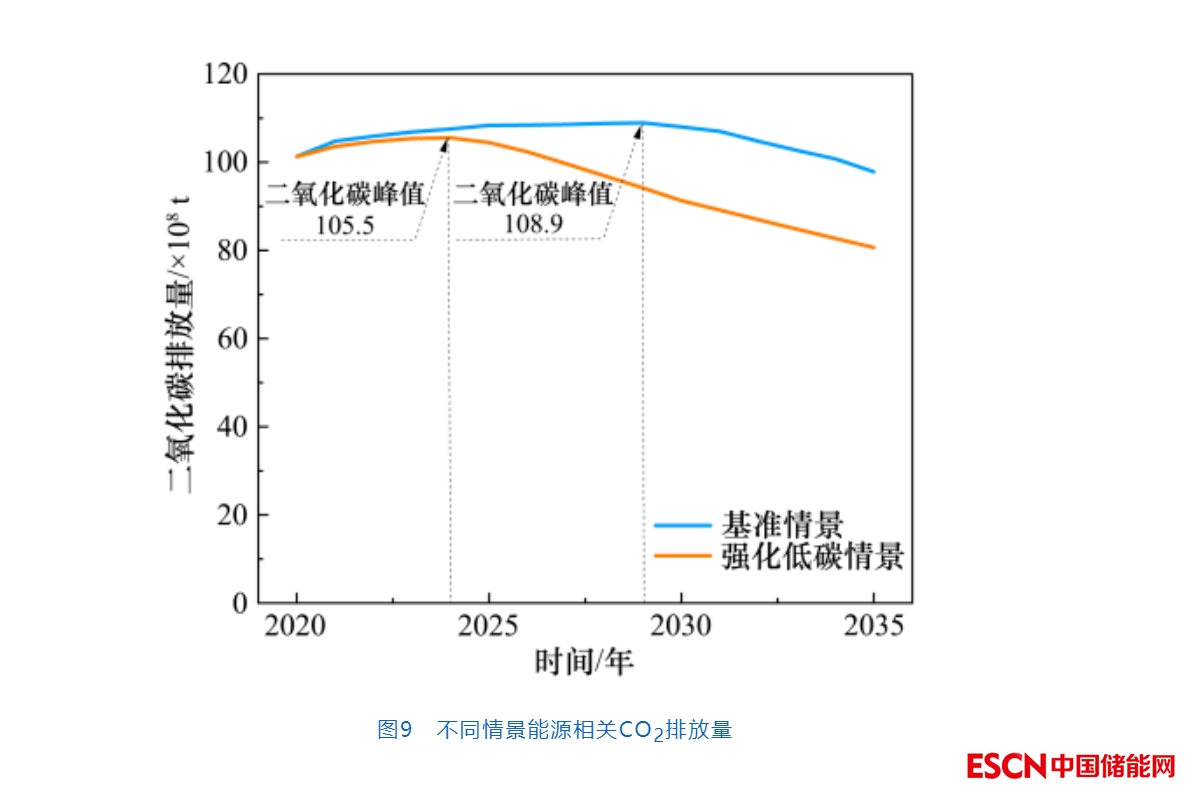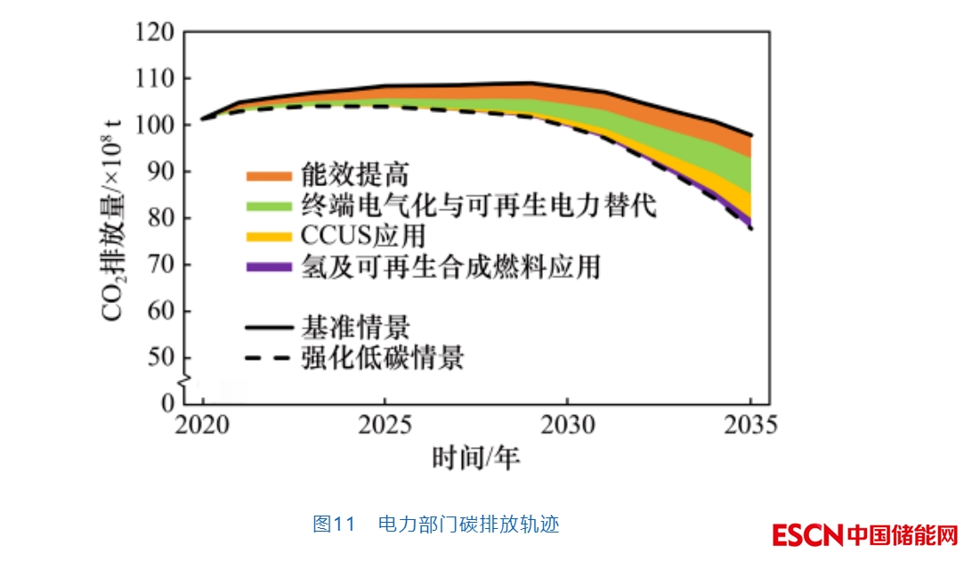 電力低碳轉(zhuǎn)型對(duì)“雙碳”目標(biāo)的實(shí)現(xiàn)具有全局性意義??紤]不同外部因素的作用大小,預(yù)計(jì)2035年全社會(huì)用電量將從2021年的8.31×1012 kW·h提高到9.8×1012 kW·h(基準(zhǔn)情景)~1.22×1013 kW·h(強(qiáng)化低碳情景)。這主要?dú)w因于電氣化的快速發(fā)展,包括電力替代煤炭、石油等化石能源直接燃燒和利用,或以可再生電力等制氫,以及終端部門電氣化的強(qiáng)化等。電源結(jié)構(gòu)整體呈現(xiàn)清潔化發(fā)展的態(tài)勢(shì),煤電裝機(jī)量和發(fā)電量占比不斷下降,非化石能源裝機(jī)和發(fā)電量的占比穩(wěn)步提升。電源總裝機(jī)從2020年的2.2×109 kW增加至2035年的3.6×109 kW,增加了64.0%。煤電裝機(jī)總量下降至1×109 kW以下,相較2020年下降9.6%。氣電裝機(jī)總量超過(guò)2×108 kW,相較2020年增加122.5%??稍偕娏ρb機(jī)合計(jì)超過(guò)2.1×109 kW,是2020年的2.4倍。發(fā)電總量從2020年的7.6×1012 kW·h提高至1.27×1013 kW·h,增加了66.3%。其中,來(lái)自風(fēng)能、太陽(yáng)能的可再生電力發(fā)電量增加了近5倍,氣電發(fā)電量增加了1.9倍,核電發(fā)電量增加了2.4倍。從碳排放來(lái)看,電力系統(tǒng)碳排放預(yù)計(jì)在2025—2030年達(dá)峰,達(dá)峰后進(jìn)入短暫平臺(tái)期,然后開(kāi)始下降(見(jiàn)圖11)。電力系統(tǒng)的清潔化和低碳化將對(duì)全社會(huì)的碳排放下降帶來(lái)實(shí)質(zhì)性貢獻(xiàn)。
