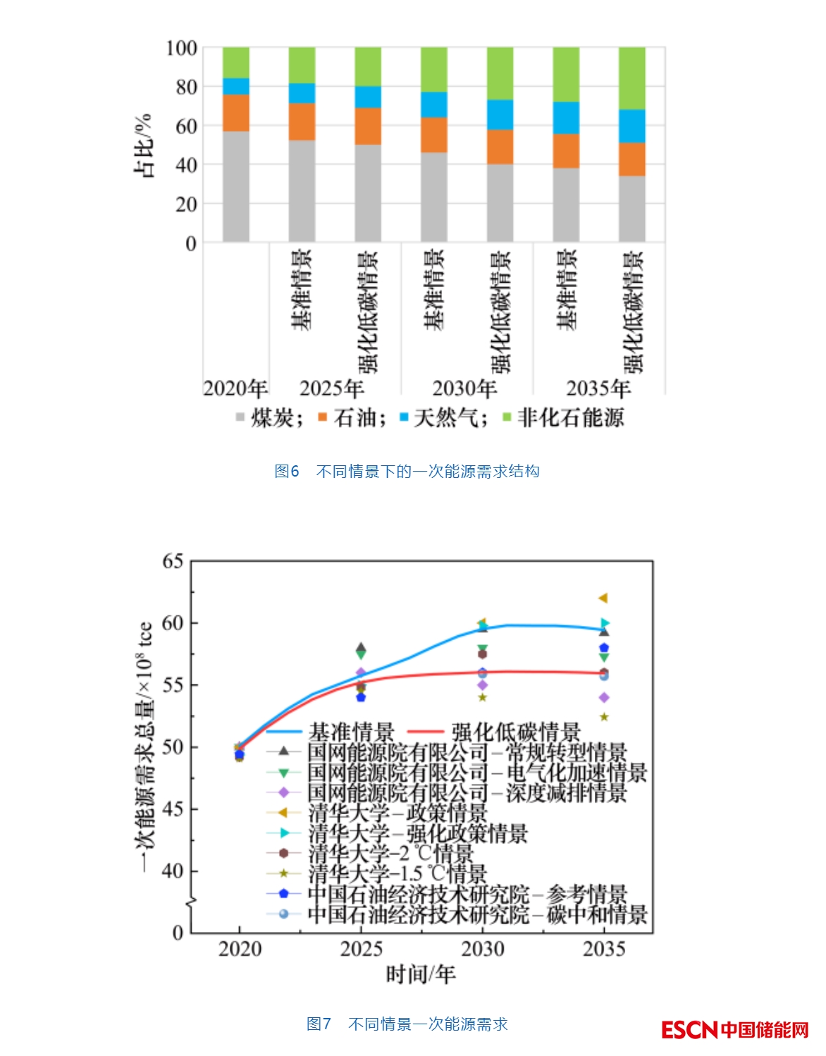 能源供應(yīng)、轉(zhuǎn)換與消費(fèi)受能源技術(shù)、經(jīng)濟(jì)社會(huì)、政策因素等多方面的綜合影響。圖5為2035年強(qiáng)化低碳情景下我國(guó)的能源供應(yīng)、轉(zhuǎn)換與消費(fèi)情況。從能源供應(yīng)能力看,2035年前煤炭在我國(guó)能源供應(yīng)中依舊發(fā)揮重要的保障作用。煤炭將提供34%左右的一次能源供應(yīng),相較2020年降低約22.8%(見(jiàn)圖6中強(qiáng)化低碳情景)。天然氣的供應(yīng)能力將達(dá)到9.5×108 tce,約占能源供應(yīng)總量的17%,較2020年的天然氣消費(fèi)量翻一倍。非化石能源供應(yīng)將提高至1.794×109 tce,約占一次能源供應(yīng)總量的32%??梢?jiàn),煤炭依然將發(fā)揮重要的能源安全保障兜底作用,天然氣將起到重要的過(guò)渡支撐作用。隨著能源結(jié)構(gòu)不斷向綠色低碳化轉(zhuǎn)變,風(fēng)光等可再生能源在能源結(jié)構(gòu)中的占比顯著上升。相比2020年,包括風(fēng)光在內(nèi)的非化石能源占比將提高12.1~16.1個(gè)百分點(diǎn)。預(yù)計(jì)到2035年,風(fēng)電、光伏、水電等一次電力供應(yīng)能力合計(jì)將達(dá)到7.76×108 tce,占一次電力供應(yīng)總量的比例達(dá)到83.7%(見(jiàn)圖5)。屆時(shí),我國(guó)將基本形成煤炭、油氣和新能源“三足鼎立”的能源供應(yīng)格局。
