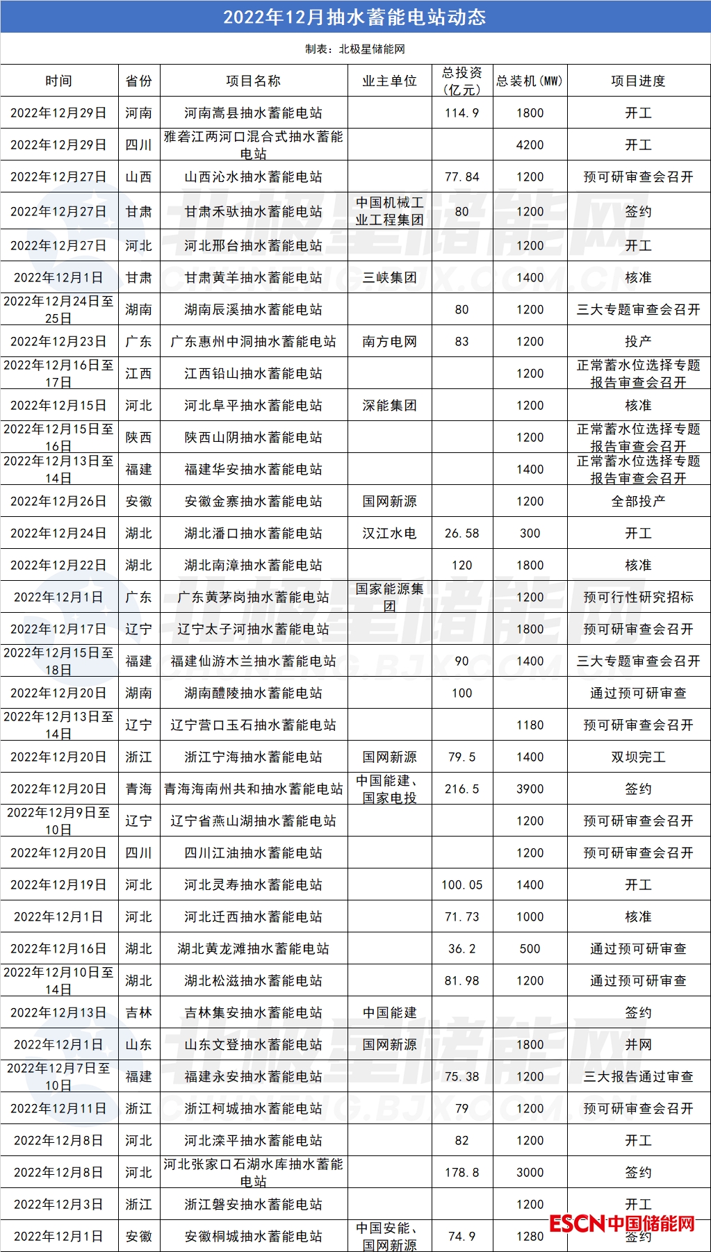 中國儲能網(wǎng)訊:據(jù)不完全統(tǒng)計,2022年12月共有36個總裝機容量49960MW的抽水蓄能電站啟動預可研審查、核準、開工、投產等。
