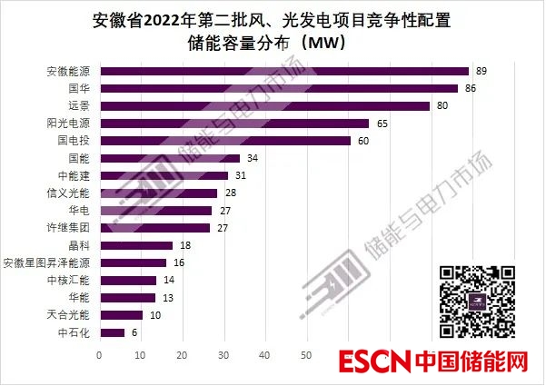 簡單以每個(gè)項(xiàng)目按平均值(光伏13.5%,風(fēng)電26.5%)進(jìn)行儲(chǔ)能配置進(jìn)行計(jì)算,則安徽省能源集團(tuán)有限公司可能對儲(chǔ)能需求最大,為89MW,其次為國華,86MW。如下圖所示。