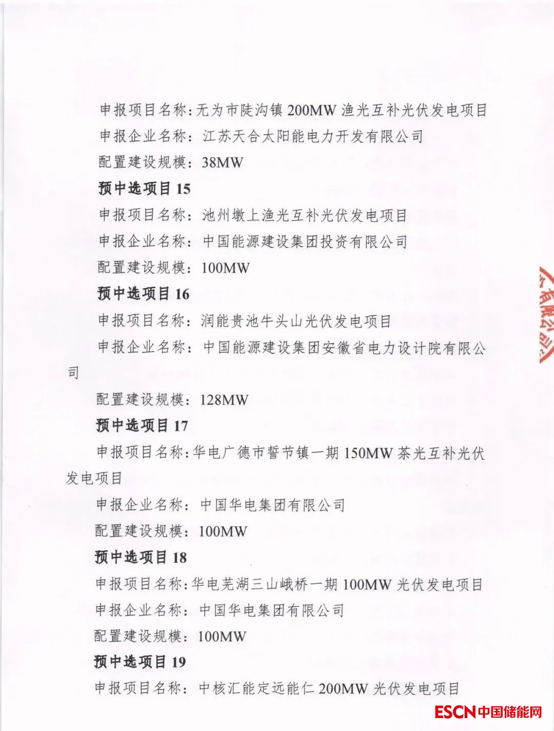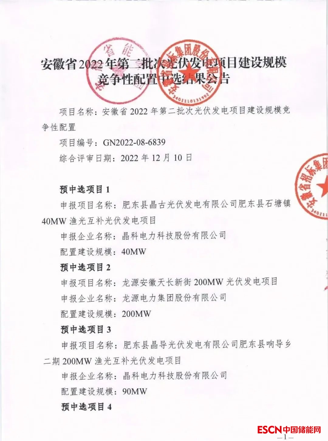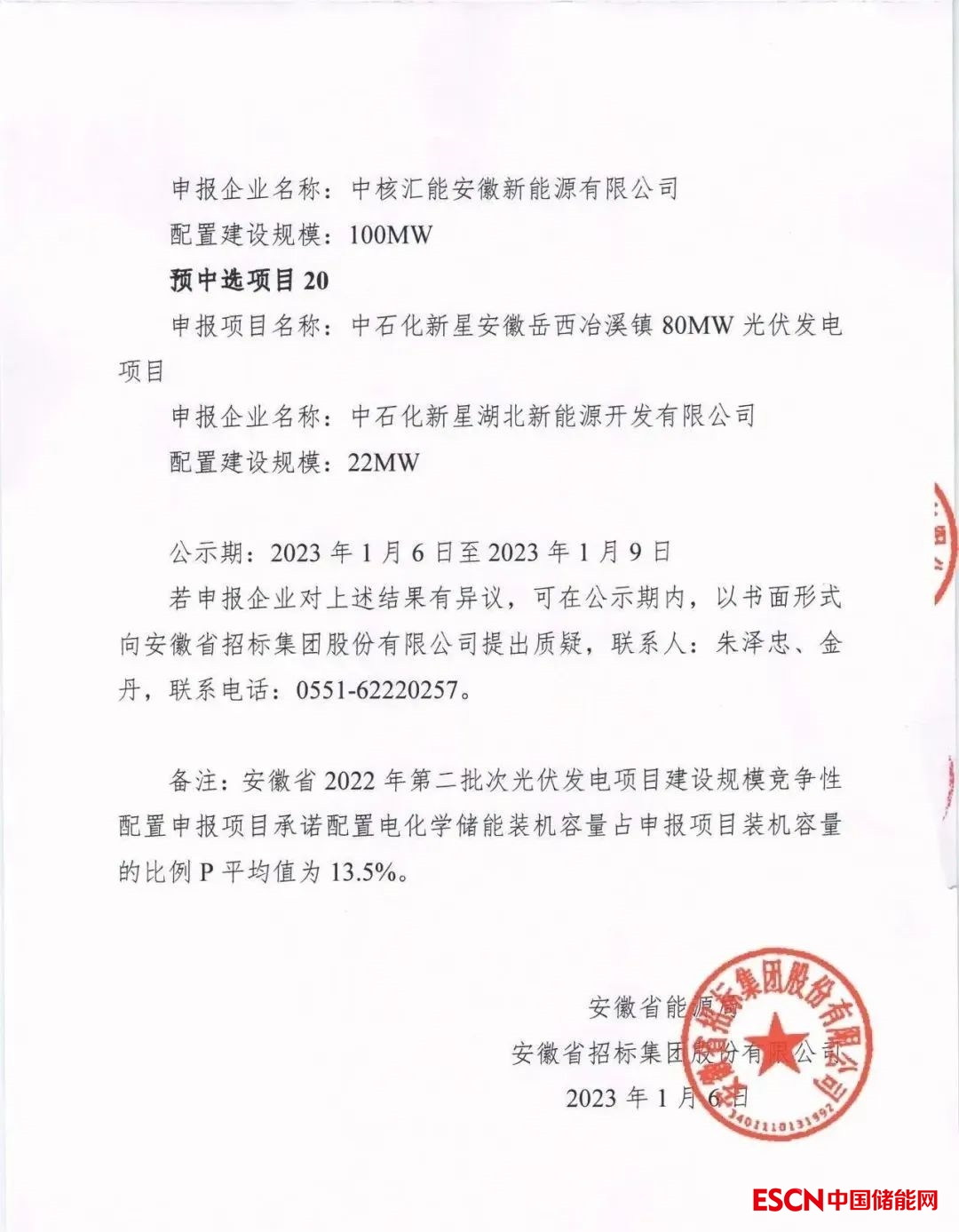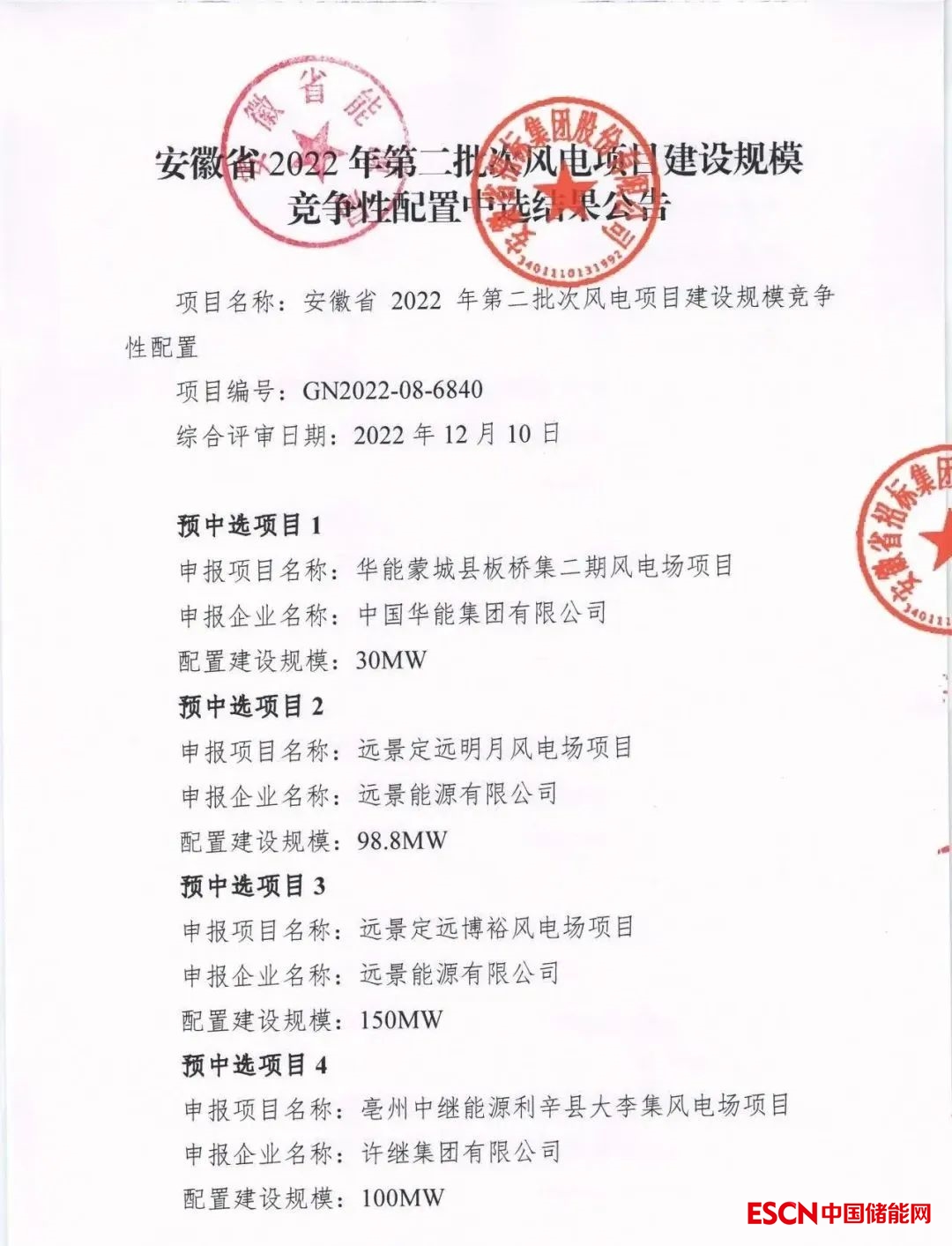 中國儲(chǔ)能網(wǎng)訊:近日,安徽省能源局發(fā)布了《安徽省2022年第二批光伏發(fā)電項(xiàng)目建設(shè)規(guī)模競爭性配置中選結(jié)果公示》、《安徽省2022年第二批風(fēng)電發(fā)電項(xiàng)目建設(shè)規(guī)模競爭性配置中選結(jié)果公示》。
