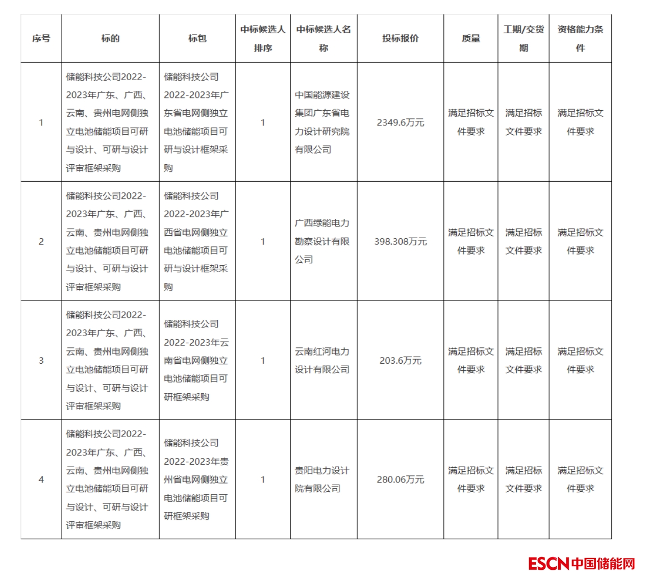 中國儲能網(wǎng)訊:1月12日,南方電網(wǎng)儲能科技公司2022-2023年廣東、廣西、云南、貴州電網(wǎng)側(cè)獨立電池儲能項目可研與設(shè)計、可研與設(shè)計評審框架采購中標(biāo)候選人公示。