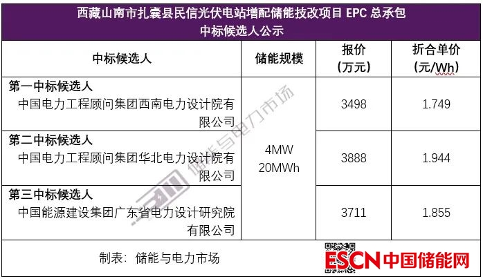 中國(guó)電力工程顧問集團(tuán)西南電力設(shè)計(jì)院有限公司以總報(bào)價(jià)3498萬(wàn)元,折合單價(jià)1.749元/Wh,成為第一中標(biāo)候選人。第二、第三中標(biāo)候選人報(bào)價(jià)分別為:1.944元/Wh,1.855元/Wh。